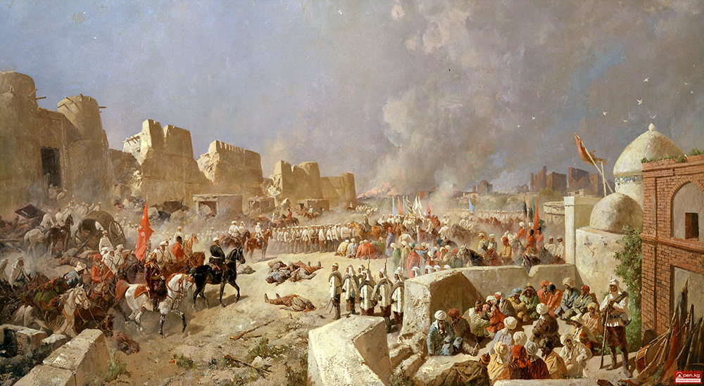 Im Mai 1868 wurde die Stadt von der russischen Armee unter dem Kommando von General Konstantin Kaufman erobert. Im selben Jahr, als die russischen Truppen den Emir von Buchara verfolgten, wurde in der Festung von Samarkand eine sehr kleine russische Garnison zurückgelassen. Sie umfasste insgesamt nicht mehr als siebenhundert Mann und war nur mit Gewehren, Mörsern und zwei russischen Kanonen bewaffnet. In der Stadt befanden sich noch 24 Bucharer Kanonen, die jedoch verschraubt waren und nicht benutzt werden konnten.