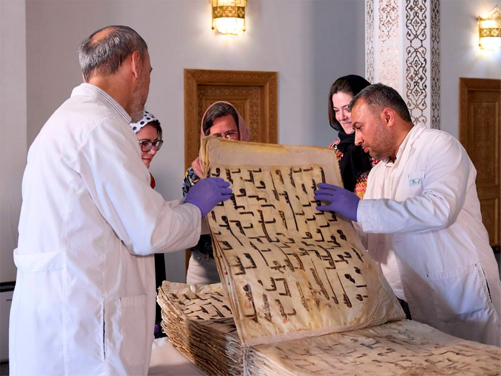 Restauratoren begutachten den Koran von Uthman, 2024. Foto: Pressedienst der Stiftung für Kultur und Kunstentwicklung Usbekistans