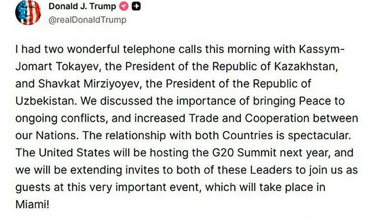 „Heute Morgen hatte ich zwei wunderbare Telefongespräche mit Qassym-Schomart Toqajew, dem Präsidenten der Republik Kasachstan, und Shavkat Mirziyoyev, dem Präsidenten der Republik Usbekistan. Wir besprachen die Bedeutung der Herstellung von Frieden in den aktuellen Konflikten sowie die Ausweitung von Handel und Zusammenarbeit zwischen unseren Ländern. Die Beziehungen zu beiden Ländern sind ausgezeichnet. Im nächsten Jahr werden die Vereinigten Staaten den G20-Gipfel ausrichten, und wir werden beiden Führern Einladungen zukommen lassen, uns als Gäste bei diesem sehr wichtigen Ereignis in Miami zu begleiten!“, heißt es in Trumps Beitrag.