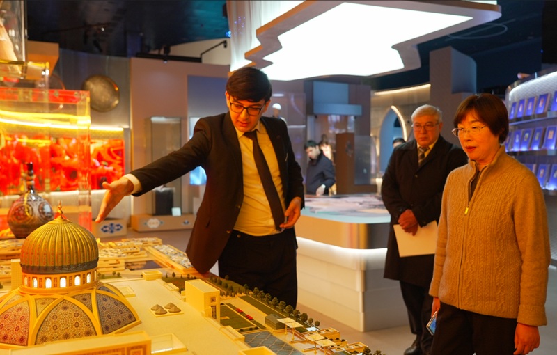 Zunächst besichtigte die Delegation die „Halle des Ruhms“, in der durch architektonische und künstlerische Gestaltung die Bilder großer Denker und Staatsmänner, die aus Zentralasien stammen, präsentiert werden. Im Bereich, der der vorislamischen Zeit gewidmet ist, wurden die Kultur des alten Choresmien, Sogdiens und Baktriens, das Erbe der „Avesta“ sowie archäologische Funde gezeigt.