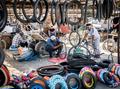 Wir aßen mit Vergnügen Eis zusammen mit einheimischen Schulkindern. Dabei fiel uns ein auffälliges Merkmal des lokalen Lebens auf: Im Straßenverkehr von Margilan spielt der zweirädrige Verkehr eine sehr große Rolle. Gemeint sind jedoch nicht Motorräder, sondern vor allem Fahrräder sowie Mopeds, Motorroller und Scooter. Eine naheliegende Erklärung dafür liegt im absolut flachen Relief des zentralen Teils des Fergana-Tals, das den Zweiradverkehr zu einem praktischen Fortbewegungs- und Transportmittel macht. Im Gedränge der lokalen Basare und der engen Gassen rundherum wimmeln Fahrräder und Scooter flink umher wie kleine Fische in einer reißenden Strömung.