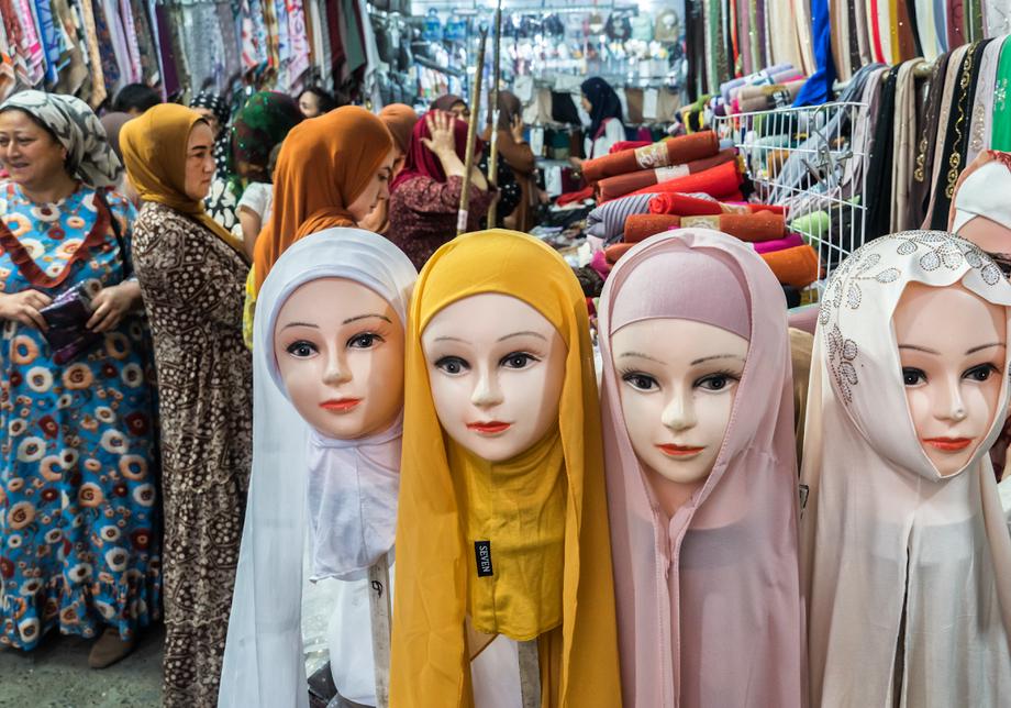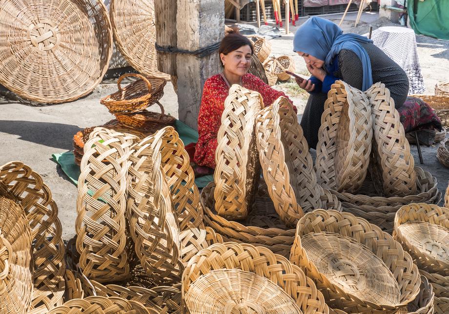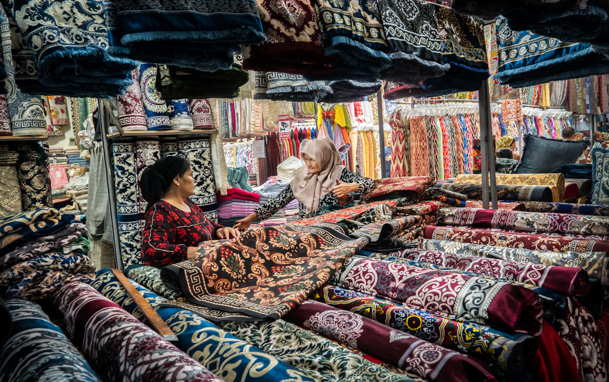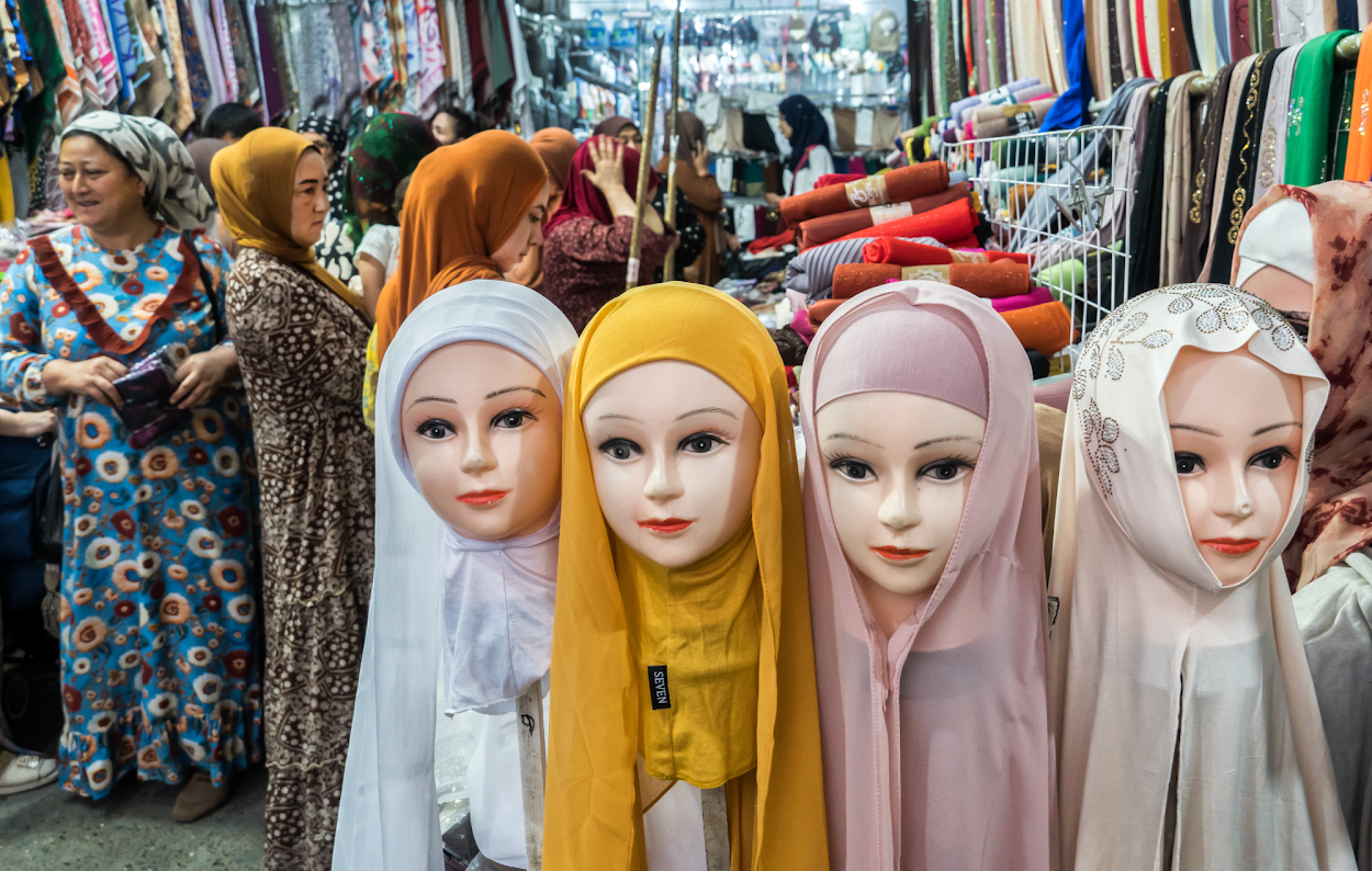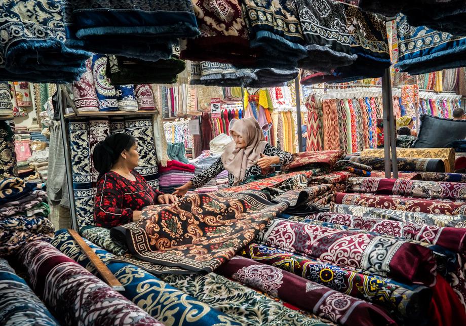 Dann gingen wir zum riesigen Basar „Kombinatskiy“. Dort werden Stoffe verkauft, die in den örtlichen Seidenmanufakturen hergestellt werden. Aber nicht nur das. Teppiche, Kleidung, Bettwäsche, Lebensmittel und Haushaltswaren – alles ist chaotisch vermischt zu einer bizarren Palette, von der einem schwindelig wird.