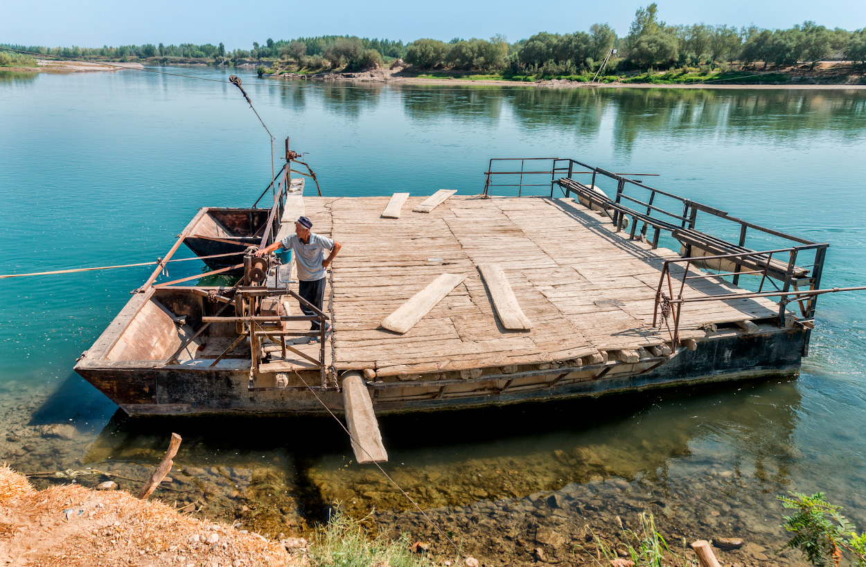 Bereits in der Region Namangan, im Dorf Gurumsarai, fotografierten wir einen Fährmann und die motorisierte Fähre über den Fluss Syrdarja, die im Herbst wegen des niedrigen Wasserstands im Fluss nicht in Betrieb ist.