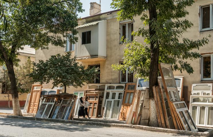 Unseren ersten Halt in Margilan machten wir in einer Straße, in der Fenster und Türen verkauft werden – sowohl moderne Kunststoffprofile als auch alte, gebrauchte Stücke, möglicherweise aus bereits abgerissenen Gebäuden. Es war ein beeindruckender Anblick.